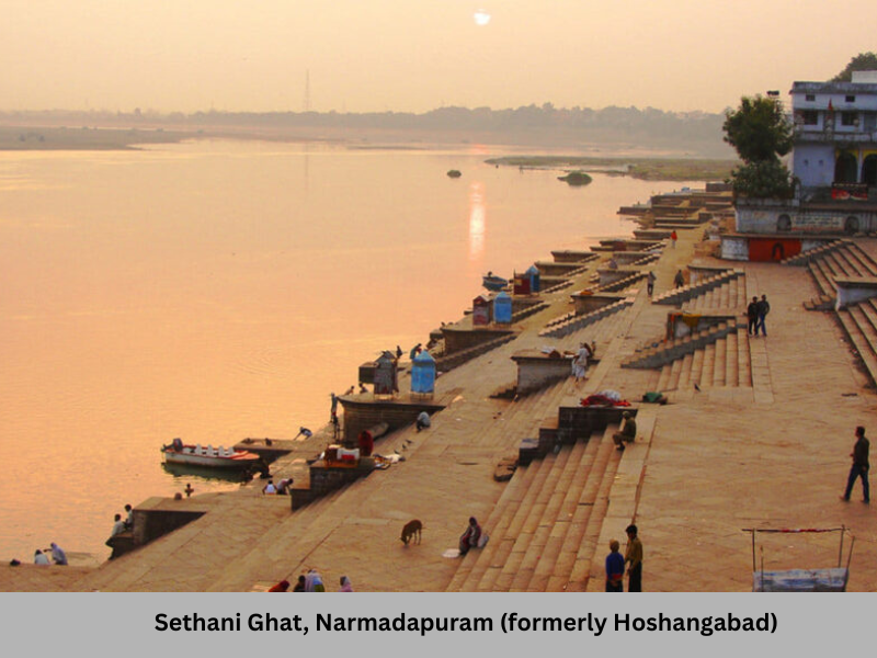 The district headquarter Narmadapuram (till recently called Hoshangabad) after Nawab of Mandavgarh Hoshang Shah, who died here, is an important town on Narmada. It has a beautiful ghat called the ‘Sethani Ghat’ built by the family of one Srimati Jaanaki Sethani in 1881. The Sethani Ghat has several temples and places for stay of Parikramavasis. There are Kathas, Pravachans and religious functions going on at the Ghat, giving it an ambience not unlike the Dashashwamedh Ghat of Varanasi. People perform Narmada Arati at the Ghat, which again recalls to the mind the Ganga Arati at Varanasi. There is a prominent place called Narmada Satsang Bhavan which regularly holds religious congregations.